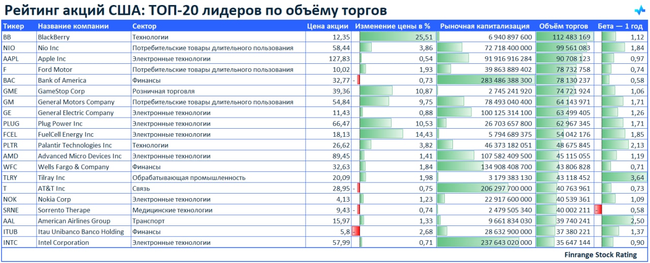 🌪Рейтинг акций США: ТОП-20 лидеров по объёму торгов🇺🇸