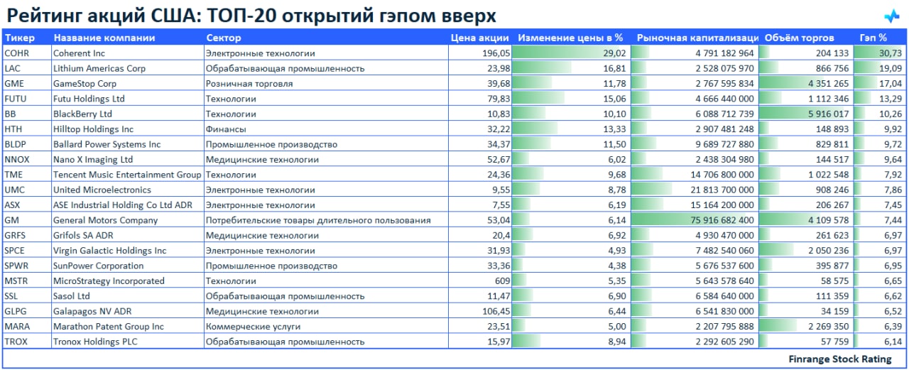 Представляем вашему вниманию топ-20 акций, которые открылись гэпом вверх. В лидерах сегодня акции Coherent Inc #COHR.