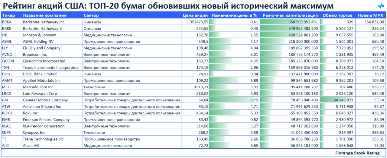 📈Рейтинг акций США: ТОП-20 бумаг обновивших новый исторический максимум🇺🇸