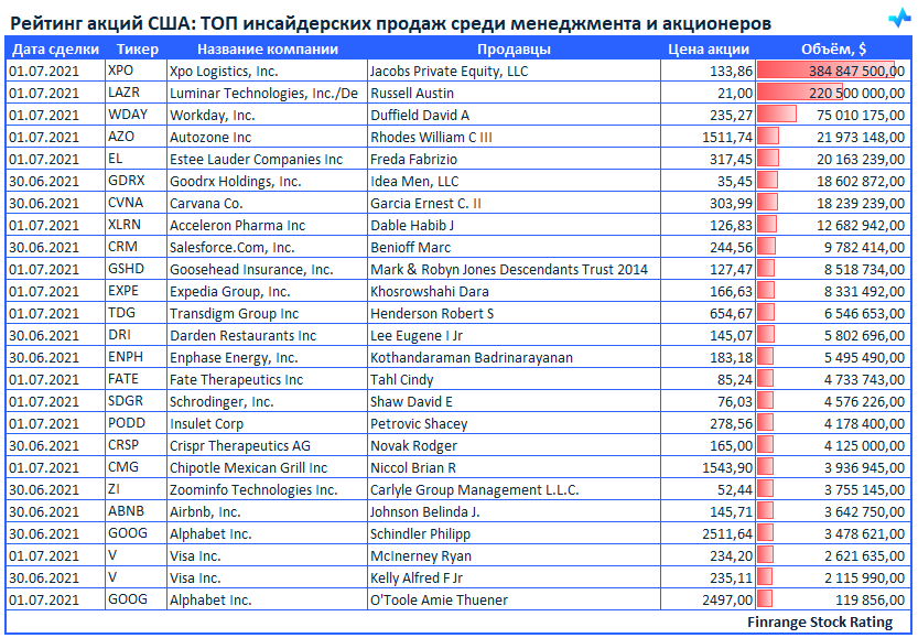 Представляем вашему вниманию свежую информацию по инсайдерским продажам среди менеджмента компаний и крупных акционеров. В этот раз больше всего продаж наблюдалось в акциях Xpo Logistics #XPO.