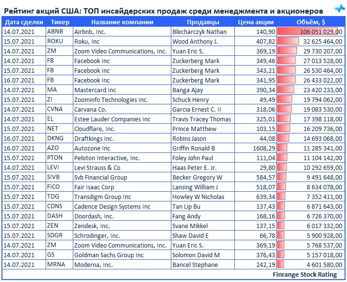 Представляем вашему вниманию свежую информацию по инсайдерским продажам среди менеджмента компаний и крупных акционеров. В этот раз больше всего продаж наблюдалось в акциях Airbnb #ABNB.