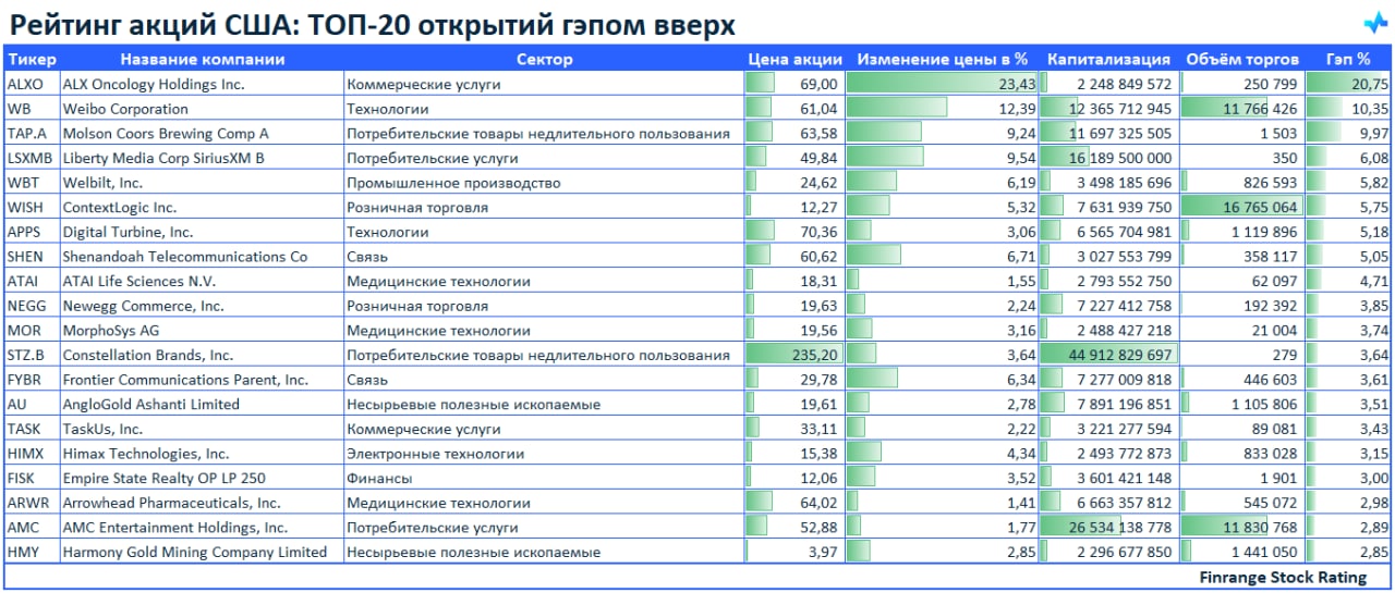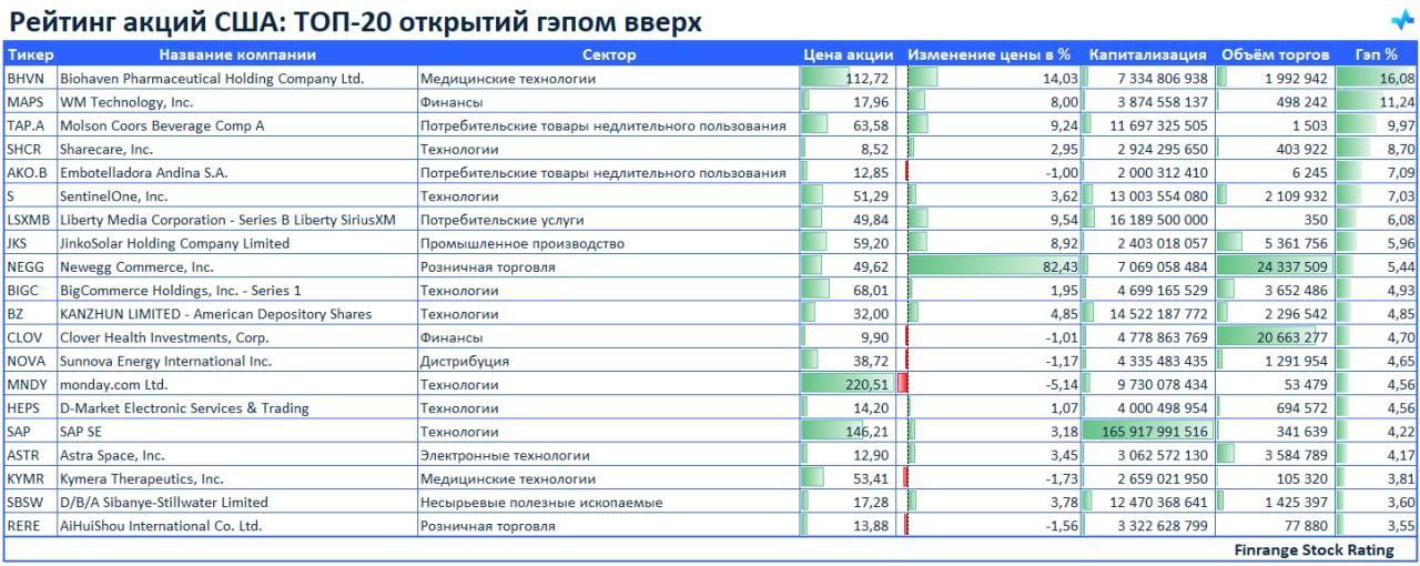 🚀Рейтинг акций: ТОП-20 открытий гэпом вверх🇺🇸