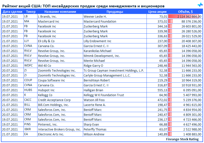 Инсайдерские продажи показывают отношение менеджмента и акционеров к компании. Обычно информация о продажи акций топ-менеджерами воспринимается негативно, считается, что они не верят в собственную компанию или возможно в ближайшее время у компании дела будут идти плохо.