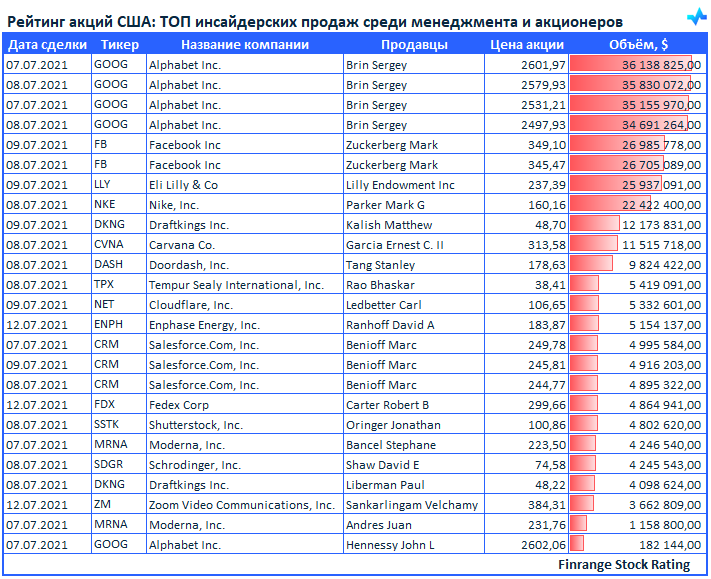 Представляем вашему вниманию свежую информацию по инсайдерским продажам среди менеджмента компаний и крупных акционеров. В этот раз больше всего продаж наблюдалось в акциях Alphabet Inc #GOOG.