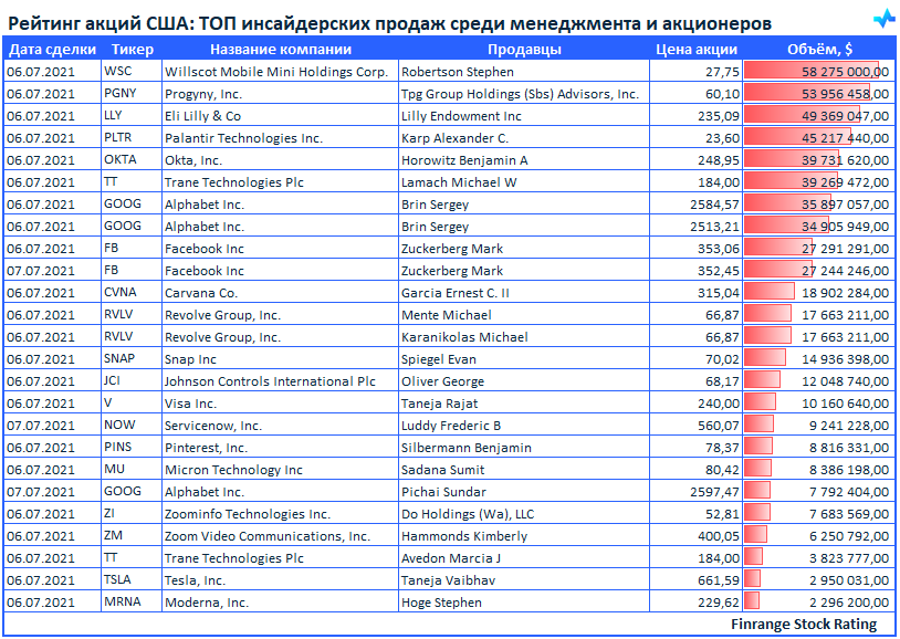 Представляем вашему вниманию свежую информацию по инсайдерским продажам среди менеджмента компаний и крупных акционеров. В этот раз больше всего продаж наблюдалось в акциях Willscot Mobile Mini Holdings #WSC.