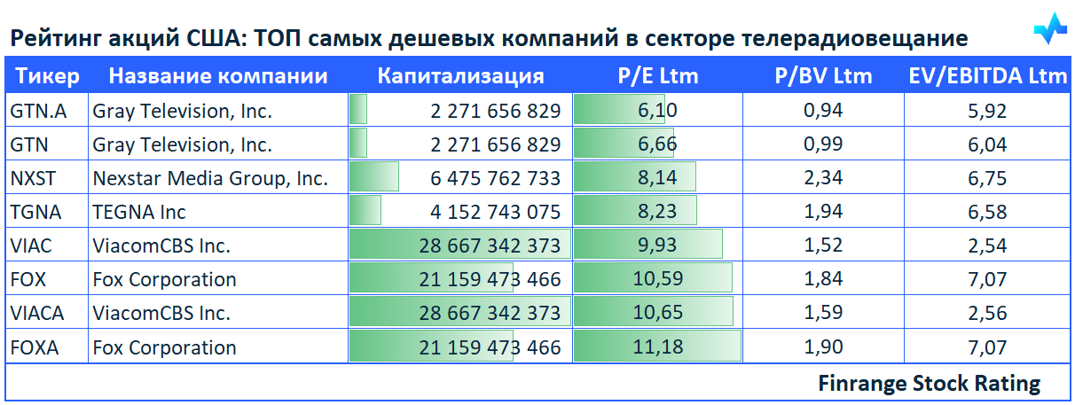 😱Рейтинг акций США: ТОП самых дешевых компаний в секторе телерадиовещание🇺🇸