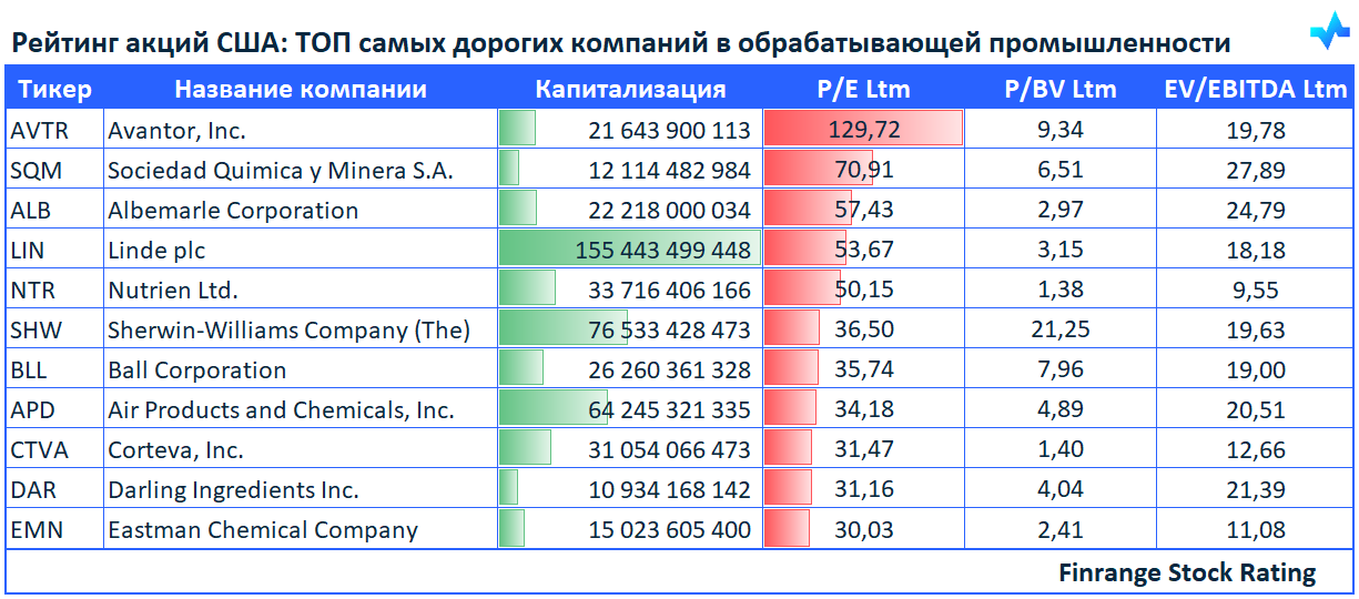Представляем подборку самых крупных компаний по капитализации и дорогих по мультипликатору P/E Ltm.
