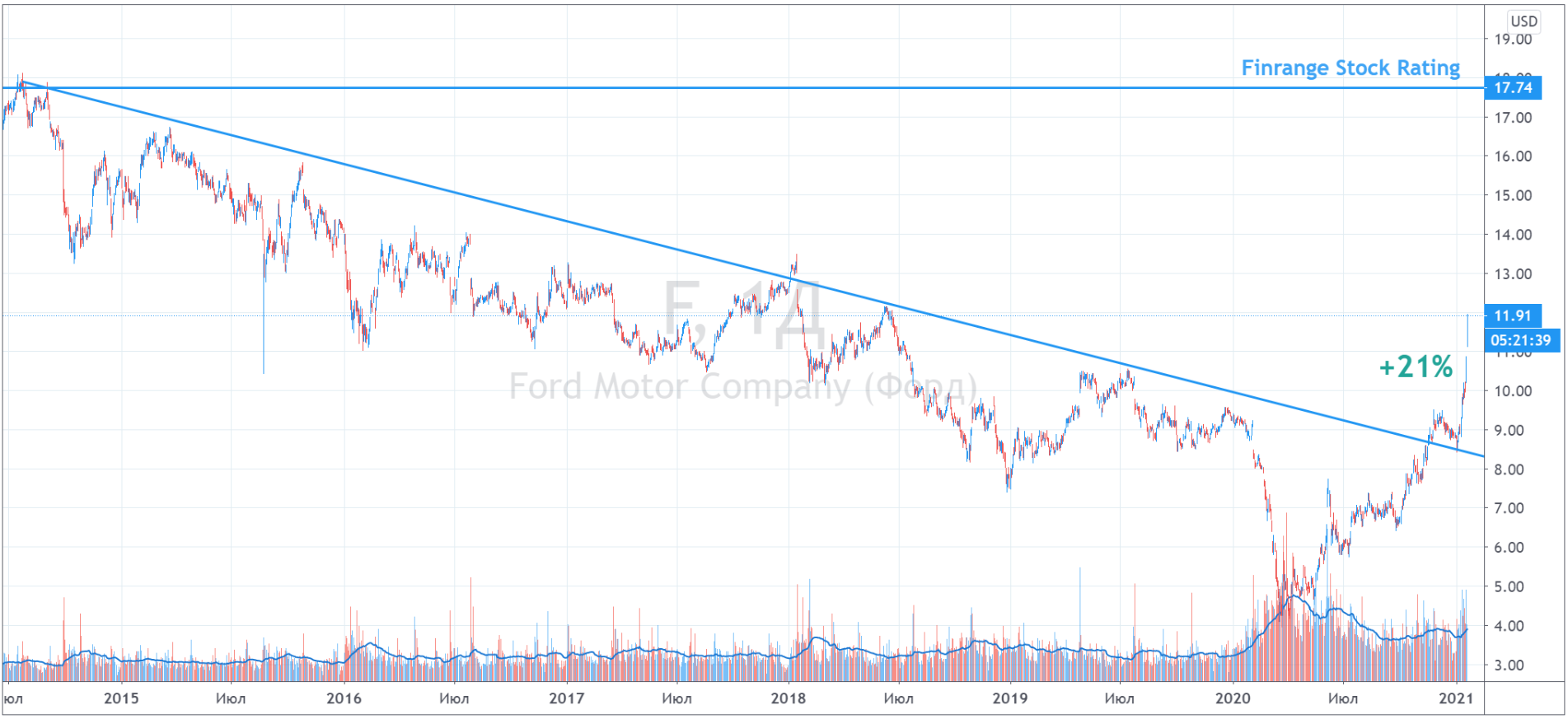 На прошлой неделе акции компании попали в наш рейтинг акций США: ТОП-20 лидеров по объёму торгов. После чего, ещё акции Ford попадали в наши рейтинги акций не этой неделе. С того момента, акции Ford выросли более чем на 20%.