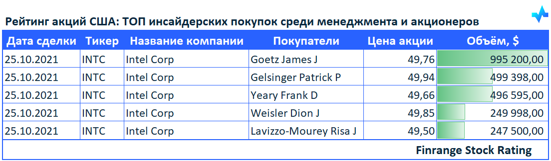 Инсайдерские покупки показывают отношение менеджмента и акционеров к компании. Обычно информация о приобретении акций топ-менеджерами воспринимается позитивно, считается, что они верят в собственную компанию. #INTC