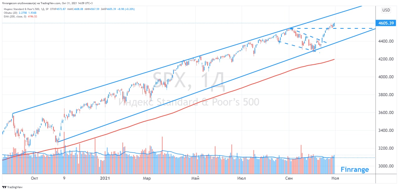 Тем временем, американский индекс S&P500 в пятницу развернулся и пошёл наверх, оценивая рост финансовых показателей компаний, несмотря на проблемы в цепочках поставок.