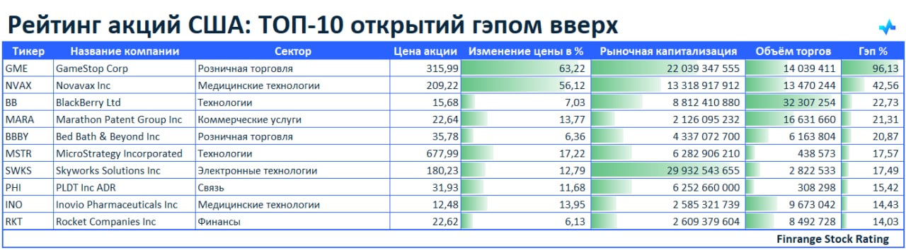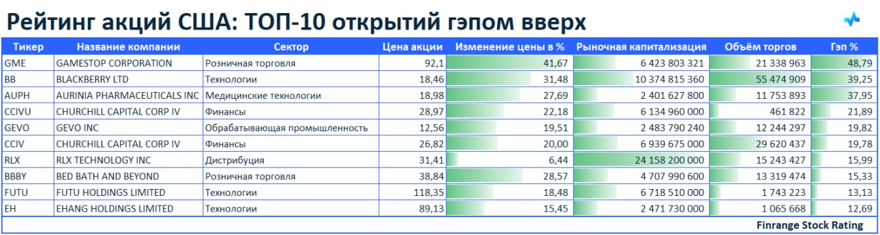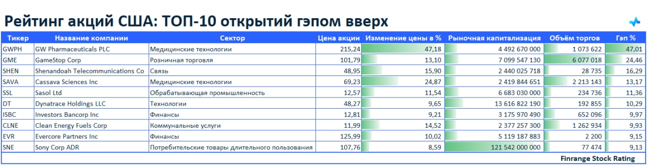 Представляем вашему вниманию топ-10 акций, которые открылись гэпом вверх. В лидерах сегодня акции GAMESTOP CORPORATION #GME.