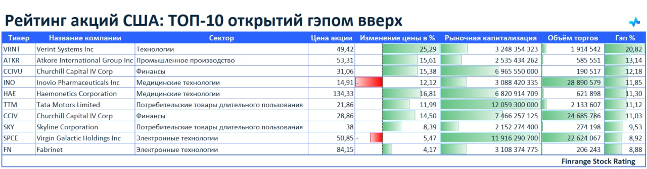 Представляем вашему вниманию топ-10 акций, которые открылись гэпом вверх. В лидерах сегодня акции Verint Systems Inc #VRNT.