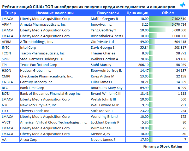 Представляем вашему вниманию свежую информацию по инсайдерским покупкам среди менеджмента компаний и крупных акционеров. В этот раз больше всего покупок наблюдалось в акциях Liberty Media Acquisition Corp #LMACA.