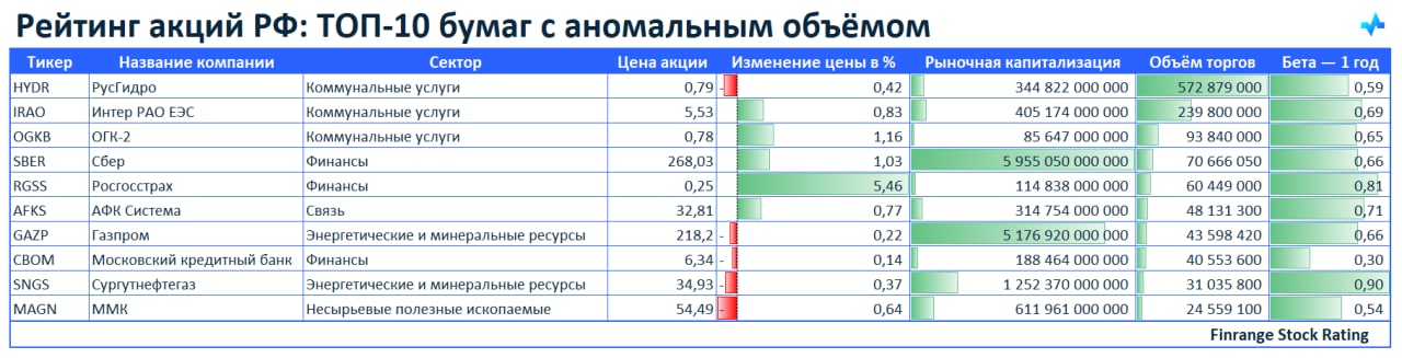 ⚡️Рейтинг акций РФ: ТОП-10 бумаг с аномальным объёмом🇷🇺