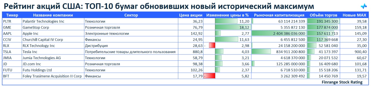 📈Рейтинг акций США: ТОП-10 бумаг обновивших новый исторический максимум🇺🇸