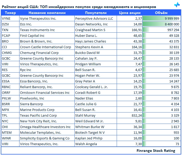 👔Рейтинг акций США: ТОП инсайдерских покупок среди менеджмента и акционеров🇺🇸