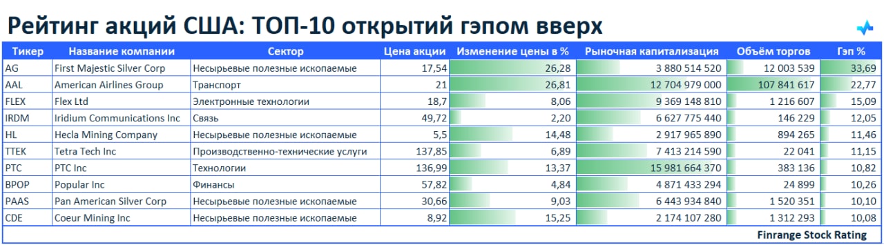 Представляем вашему вниманию топ-10 акций, которые открылись гэпом вверх. В лидерах сегодня акции First Majestic Silver Corp #AG.