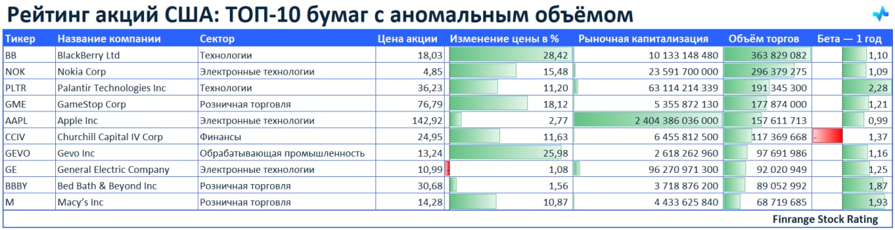 ⚡️Рейтинг акций США: ТОП-10 бумаг с аномальным объёмом🇺🇸