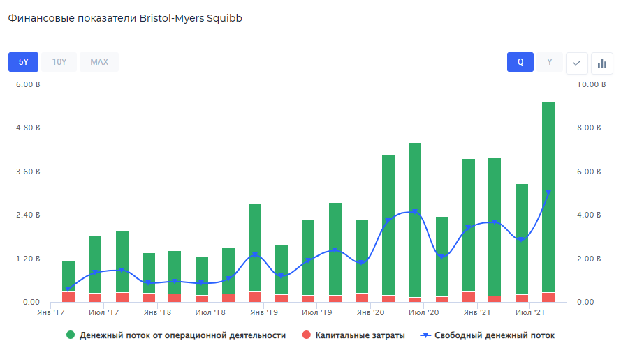 Bristol-Myers Squibb на протяжении более 30 лет стабильно выплачивает дивиденды. Совет директоров компании повысил дивиденды на IV кв. 2021 г. на 10,2% – до $0,54 на акцию.
