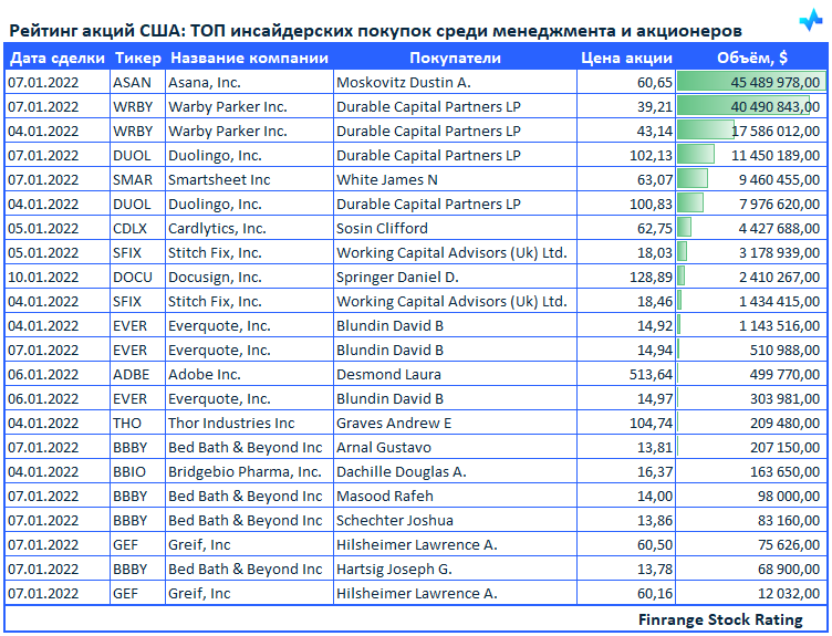 Представляем вашему вниманию свежую информацию по инсайдерским покупкам среди менеджмента компаний и крупных акционеров. В этот раз больше всего покупок наблюдалось в акциях Asana Inc #ASAN.