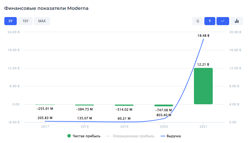 В 2021 г. компания получила выручку, значительно превосходящую показатели всех прошлых лет – $18,47 млрд против $803 млн в 2020 г. Выручка, полученная от поставок вакцины от COVID-19 составила около $17,7 млрд – в 2021 г. компанией было поставлено 807 млн доз. Операционные расходы выросли на 230,46% – до $5,18 млрд.