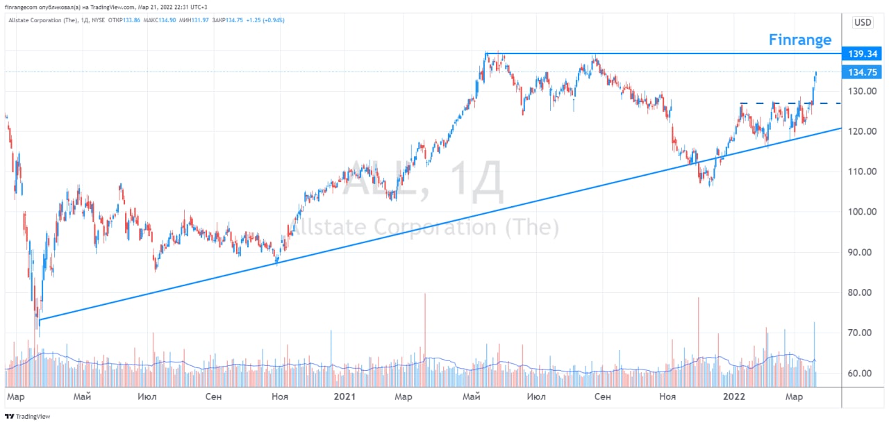 За последние несколько дней, котировки Allstate выросли более чем на 6%, преодолев локальный уровень сопротивления. Это связано с тем, что компания повысила ставки по автострахованию на 5,1% вслед за ростом инфляции. В связи с этим, со слов менеджмента, Allstate заработает дополнительные $1,2 млрд.