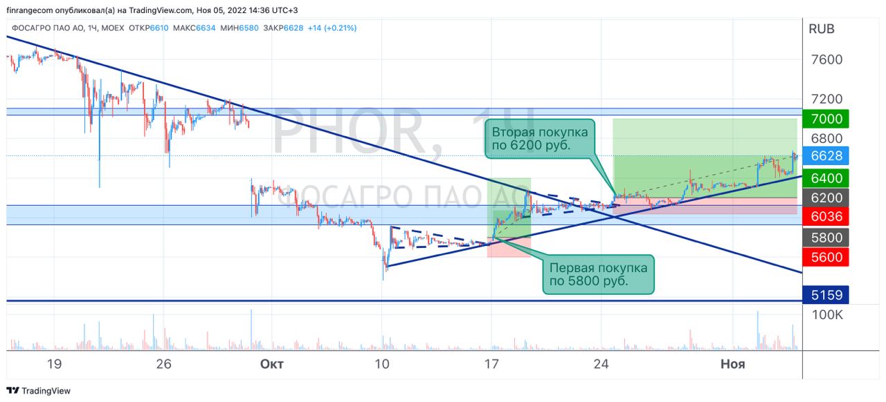 За октябрь на основе фундаментального и технического анализа я ни раз покупал акции ФосАгро. Не буду подробно расписывать о фундаментальных драйверах. Ждал роста финансовых показателей и высоких дивидендов на фоне положительной динамики цен на удобрения и укрепления рубля. Подробнее об этом можно почитать в аналитическом обзоре.