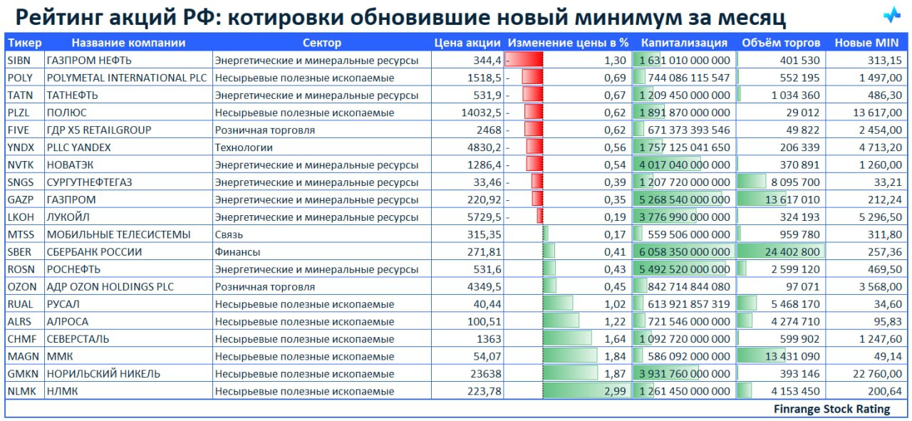 Сегодня акции на всех фондовых площадках демонстрируют сильное снижение, в такое время всегда открывается много возможностей. Для этого мы сделали новый рейтинг - новые минимумы за месяц, чтобы вы не пропустили возможность и купили акции по более привлекательным ценам.