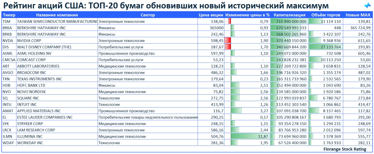 📈Рейтинг акций США: ТОП-20 бумаг обновивших новый исторический максимум🇺🇸