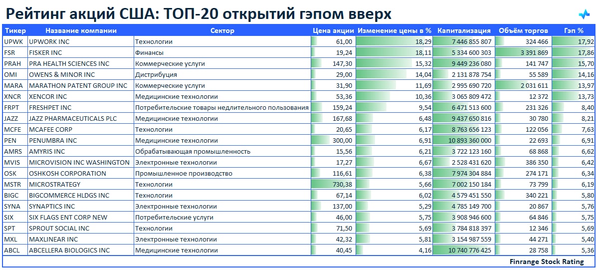 Представляем вашему вниманию топ-20 акций, которые открылись гэпом вверх. В лидерах сегодня акции UPWORK INC #UPWK.