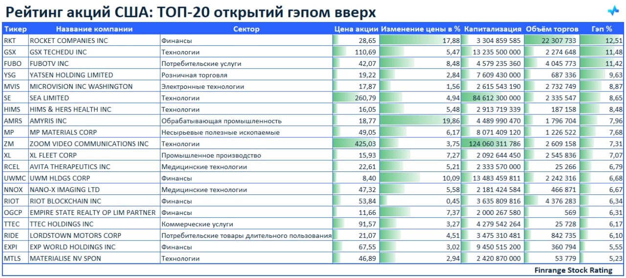 Представляем вашему вниманию топ-20 акций, которые открылись гэпом вверх. В лидерах сегодня акции ROCKET COMPANIES INC #RKT.