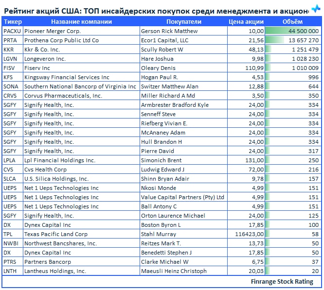Представляем вашему вниманию свежую информацию по инсайдерским покупкам среди менеджмента компаний и крупных акционеров. В этот раз больше всего покупок наблюдалось в акциях Pioneer Merger Corp #PACXU.