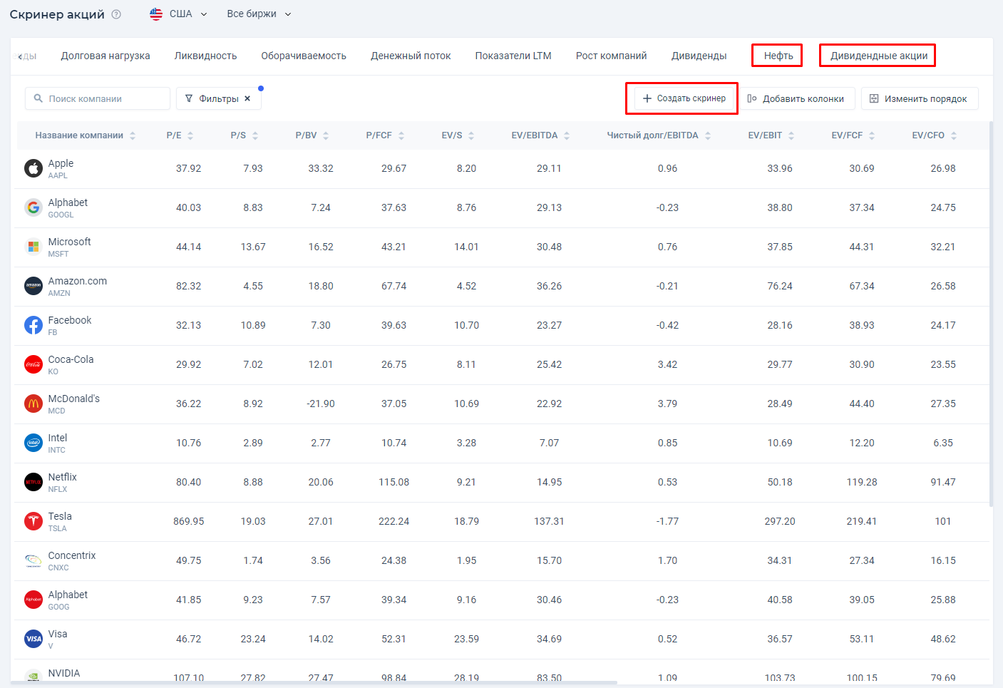Подробнее можете посмотреть самостоятельно в скринере акций.