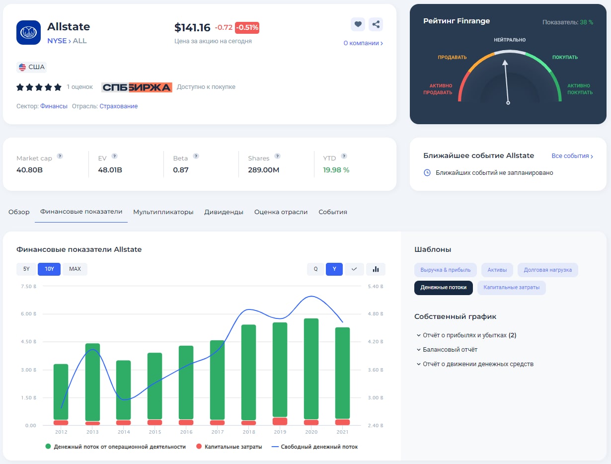 Из главного, у Allstate низкая долговая нагрузка по коэффициенту чистый долг / EBITDA – около 1,5х. А также, стабильно растёт свободный денежный поток на протяжении 10 лет, что в свою очередь, позволяет компании постоянно повышать дивиденды и выкупать собственные акции.