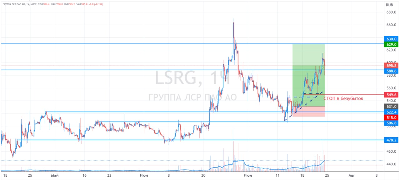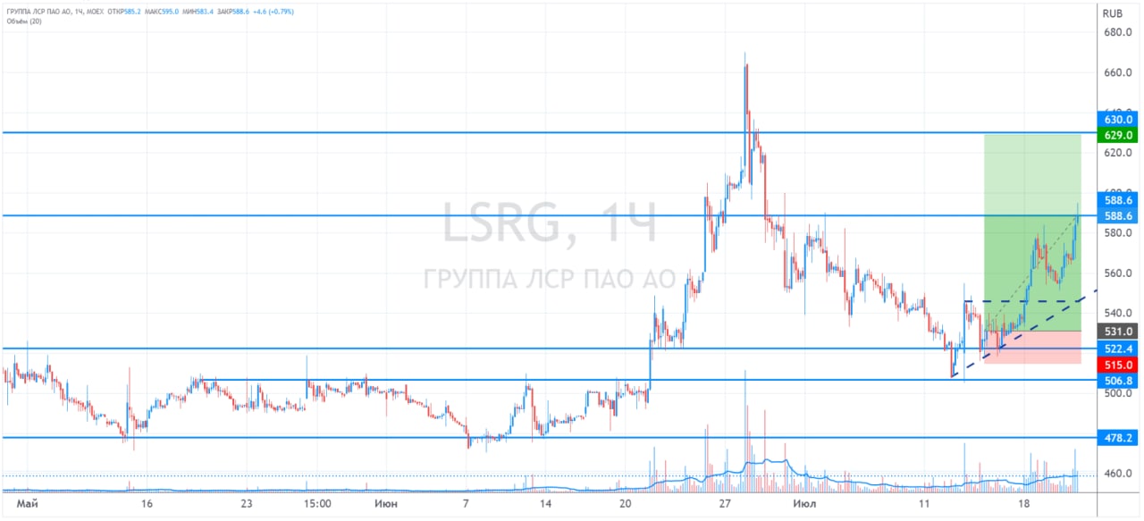 Тем не менее фундаментально при таких ставках и прогнозах, акции застройщиков выглядят интересно и находятся в восходящем тренде. Не исключаем, что акции Группы ЛСР пойдут выше к первоначальной цели – 629 руб.