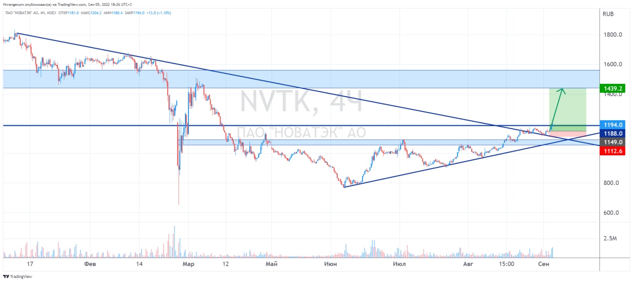 НОВАТЭК выше из зоны консолидации после пробоя нисходящей линии тренда на словах президента РФ о хороших финансовых результатах в этом году. Кроме этого, дополнительную поддержку акциям оказали высокие цен на газ, которые выросли более чем на 25% после того, как Газпром остановил прокачку газа по трубопроводу «Северный поток-1». #NVTK