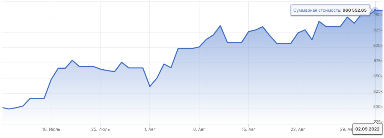 На фоне вышеперечисленного, индекс Московской биржи за месяц вырос на 8,41% – до 2400,1 пунктов. Тем временем, наш портфель вырос на 10,11% – до 954 096,05 руб. Таким образом, по новой более активной стратегии за август в деньгах мы заработали +87 630,15 руб.