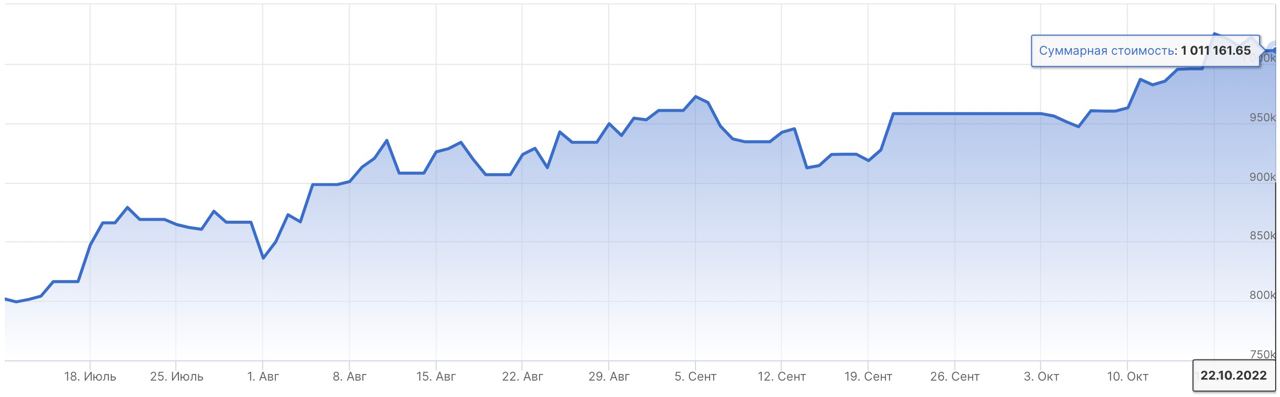 Кроме этого, мы допустили просчёт! По новой стратегии, мы всегда рассчитываем объём позиции исходя из риска и объёма средств портфеля. После каждых заработанных 100 000 руб., мы начинали увеличивали объём позиции, соответственно росли риски, но и прибыль. После того, как наш портфель перевалил за 1 000 000 руб., мы по-прежнему две недели считали исходя из 900 000 руб. Таким образом, доходность портфеля за последние две недели могла бы быть выше.