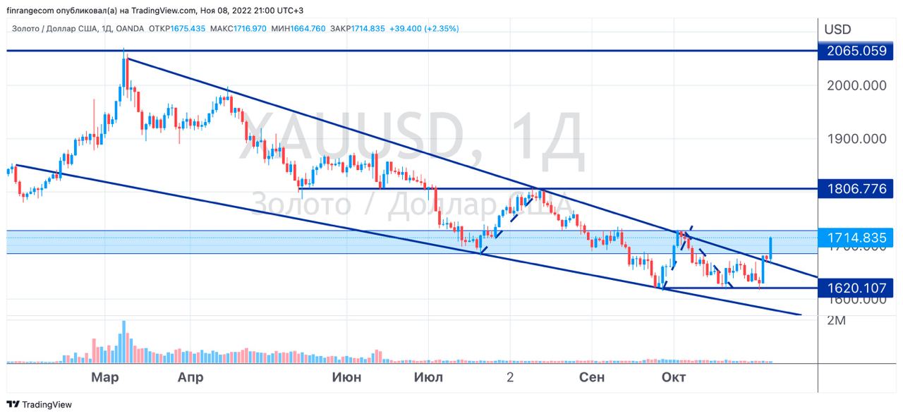 Тем временем, золото пробило долгосрочный нисходящий тренд, цены сегодня выросли более чем на 2%. Котировки золота растут 3 дня и сегодня превысили $1700 за унцию.