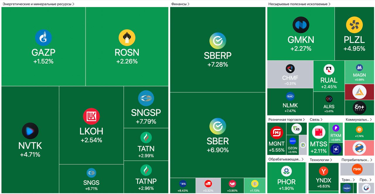 В итоге, рубль начал укрепляться в ожидании повышения процентных ставок. Рынок пошёл вниз вслед за ним, так как большая часть акций на рынке представлена экспортёрами.