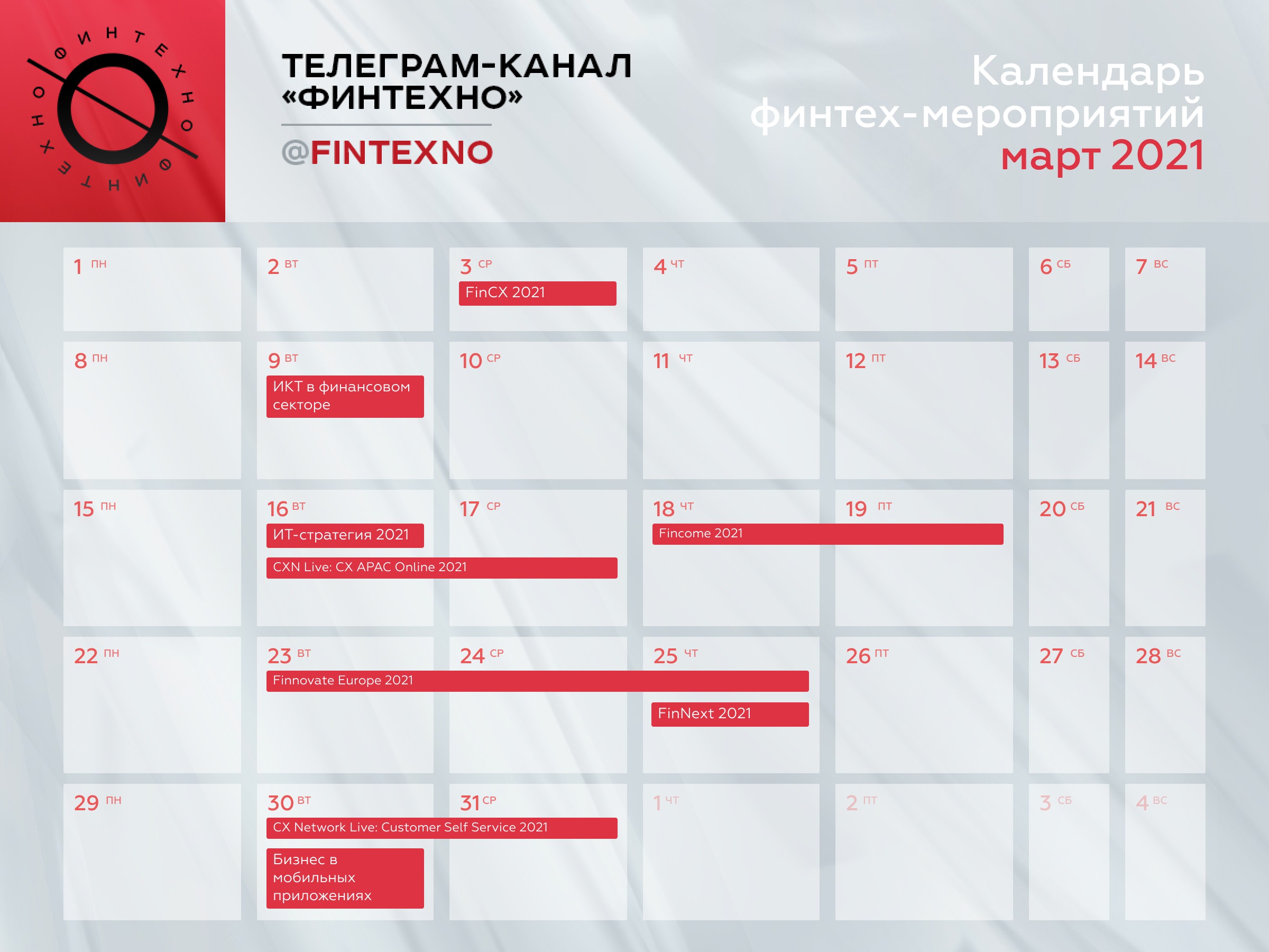 Подборка мартовских мероприятий в России и за рубежом для всех, кто развивает финтех-сервисы — руководителей цифрового бизнеса, продактов, UX и CX специалистов. Большинство — онлайн и бесплатно.