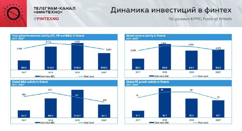 По данным KPMG, в 2020 году инвестиции в финтех значительно сократились во всем мире и составили $105 млрд. Это на $60 млрд меньше, чем в 2019 году. В первой половине года наблюдался спад из-за коронавируса, но потом объем инвестиций увеличился вдвое.