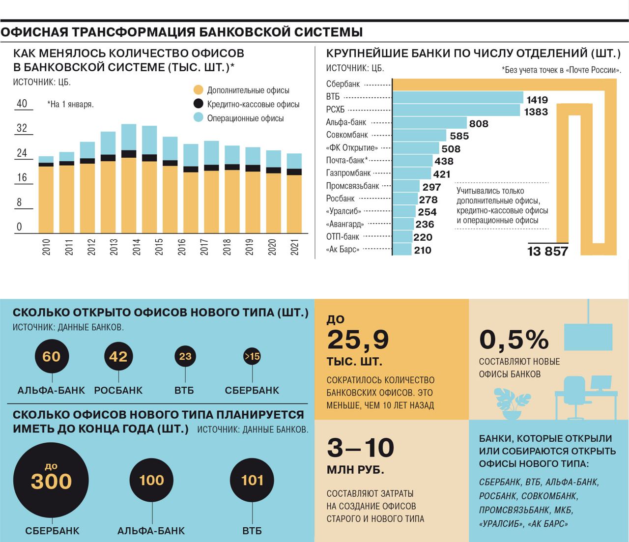 «Сбербанк» планирует открыть в каждом регионе минимум по два-три новых офиса, доведя их число до 200–300 штук. ВТБ и «Альфа-банк» — по сто. «Совкомбанк», МКБ, ПСБ, «Уралсиб» и «Ак Барс» тоже планируют трансформацию сетей отделений, но пока без конкретных целей в штуках.