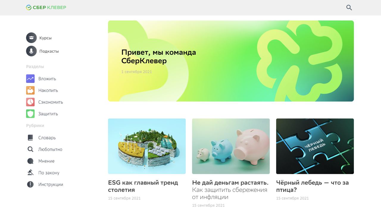 На сайте «СберКлевер» собрана информация о финансовых инструментах для накоплений, страхования и инвестиций, есть даже градация материалов по уровню сложности от нулевого до продвинутого. По некоторым темам можно найти обучающие курсы — например, как управлять личными финансами, начать инвестировать, какие налоги и преференции существуют, как выбрать страховку.