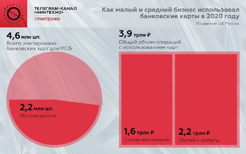 За весь 2020 год клиенты банков сегмента МСБ совершили операций по карте на 3,9 трлн рублей. Их них 2,2 трлн рублей пришлось на онлайн-оплаты — это немного больше, чем в 2019 году. 1,6 трлн рублей было снято наличными — столько же, сколько год назад.
