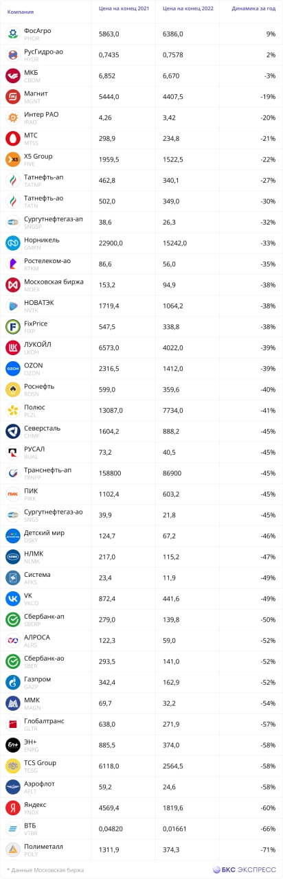 📉 В уходящем году индекс МосБиржи потерял более 40%. Из 40 его компонентов в плюсе завершают год лишь 2 акции.