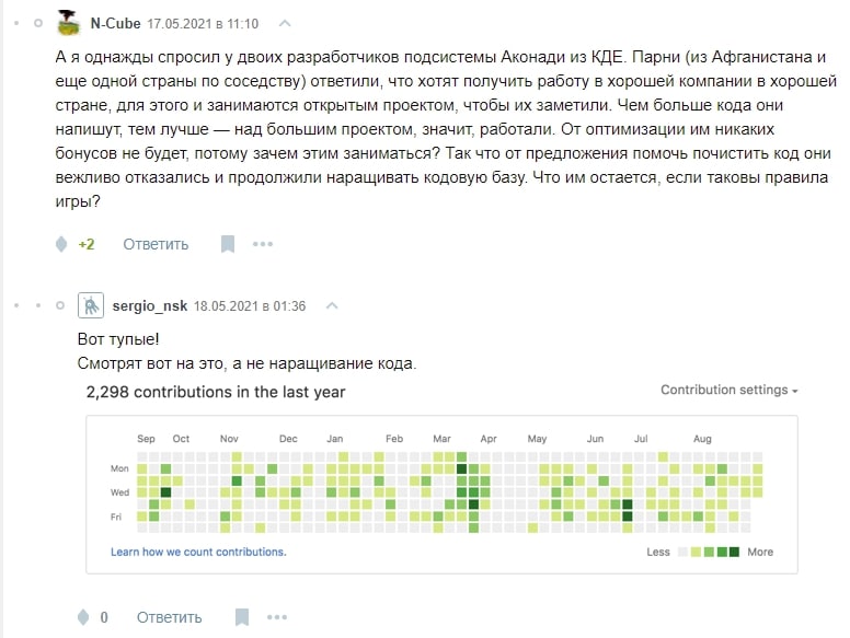 Одной из рекомендаций, которой я придерживаюсь по сегодняшний день, касается GitHub (или другой СКВ). Ключевая мысль следующая: “В некоторых профессиях работодатель может спросить про ваш GitHub аккаунт, но не смотреть на ваши проекты. Чаще всего он смотрит на вашу активность в определенной панели (скриншот ниже). Эта активность показывает, как давно и часто вы работаете с GitHub. Её нельзя «подделать» за предыдущие года. Это простая проверка на знание GitHub и отсечение самозванцев.”