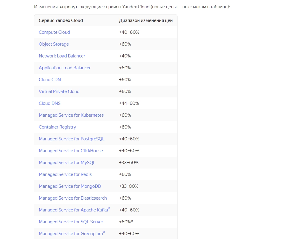 Думаю многие рассчитывали использовать яндекс облако из-за санкций. Ниже скриншот и ссылка на информацию по повышению цен (40-60%). Такие же расценки будут у всех облаков и хостеров в ближайшее время.
