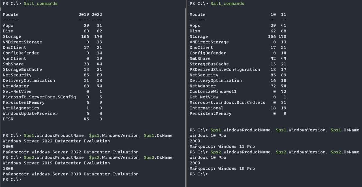 Обновленный скриншот, который показывает только различия в модулях Powershell на разных редакциях Windows. Слева - серверные редакции 2019 и 2022. Справа - клиентские версии 10 и 11.