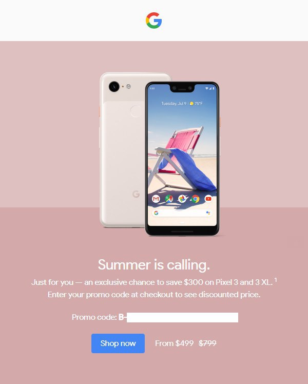 Сегодня, пришло новое письмо с темой "Let’s try again, here’s $300 off Pixel 3/3XL", "давайте попробуем снова", промокод находится в письме